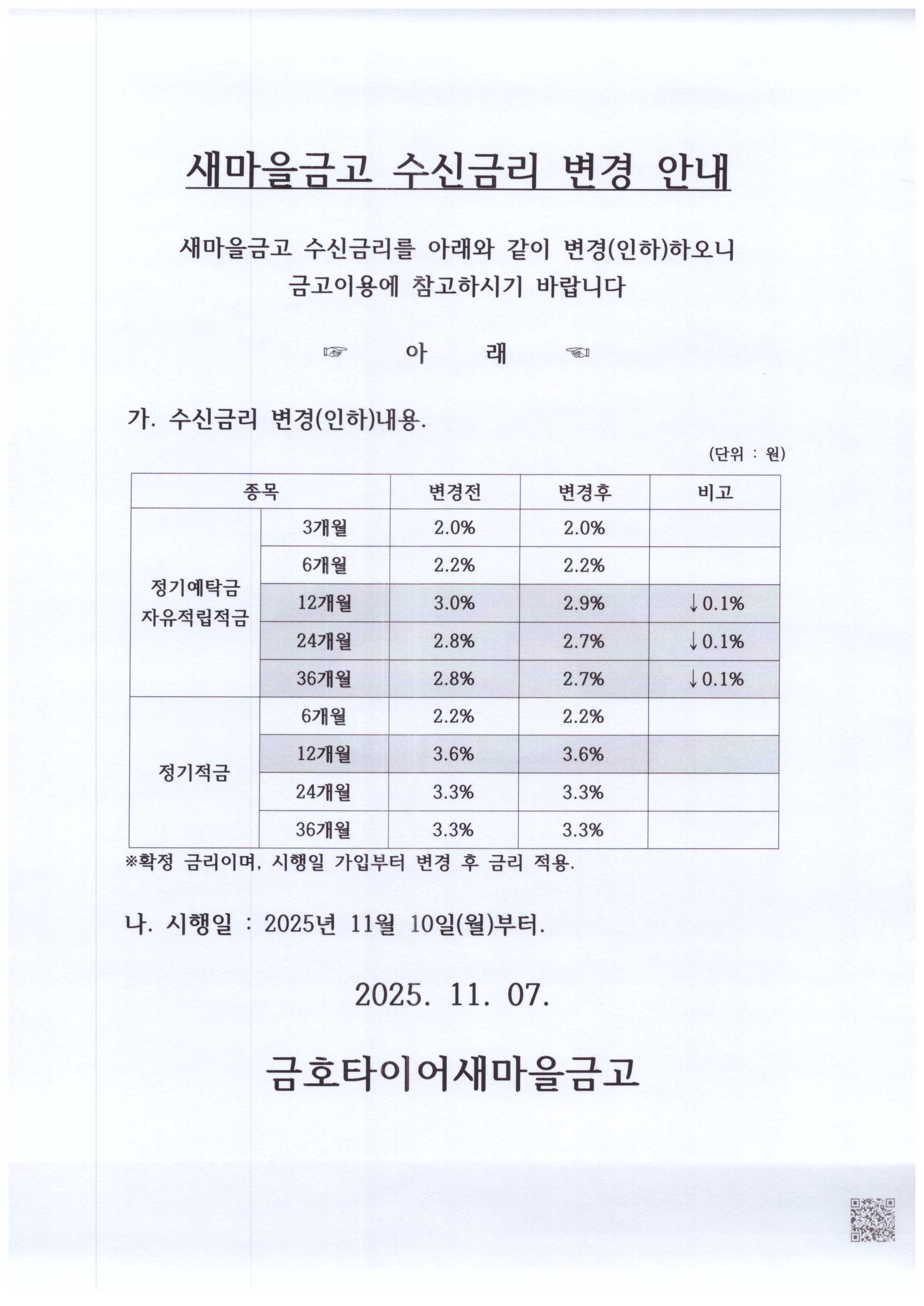 새마을금고 수신금리 변경(인하) 안내