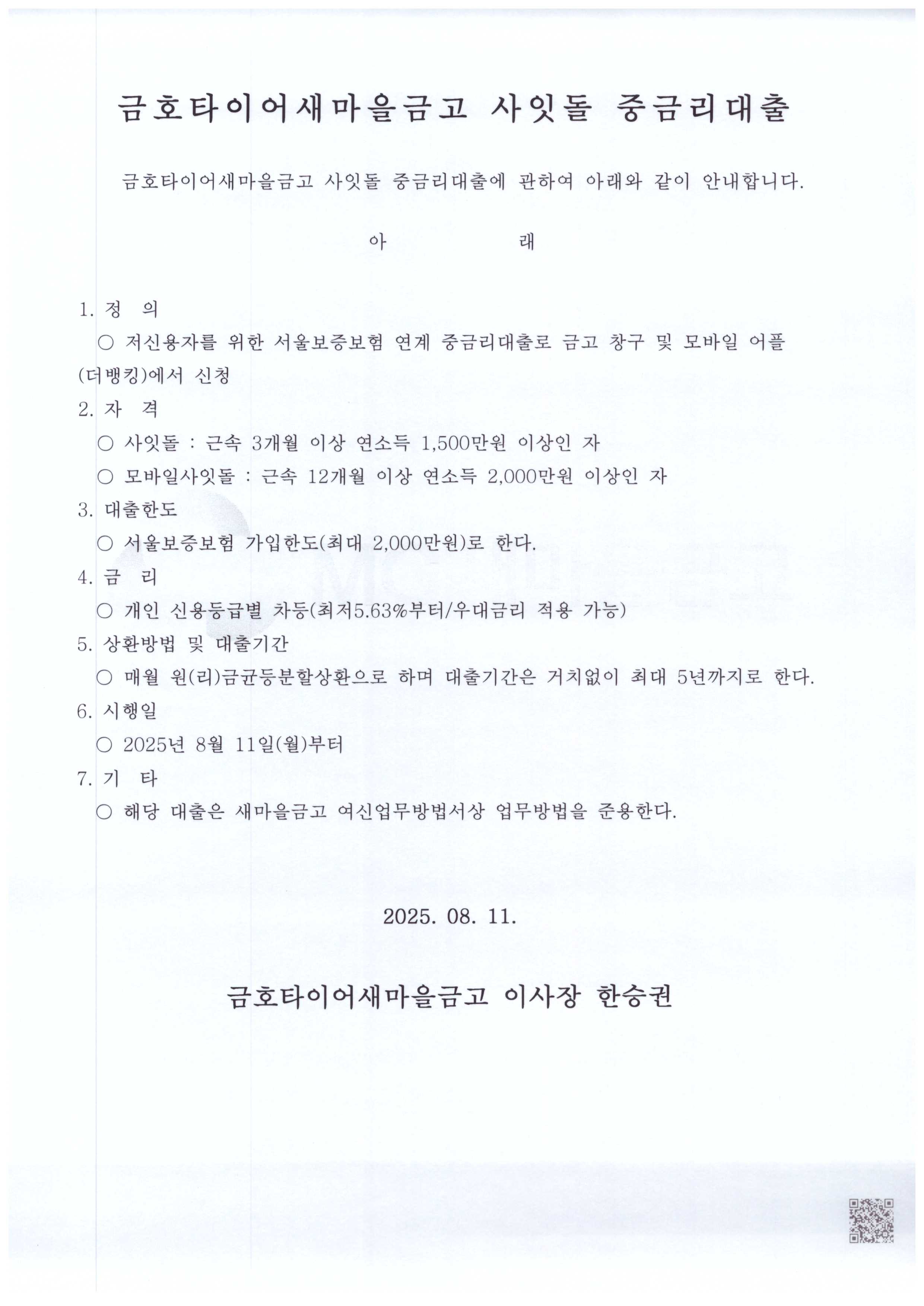 금호타이어새마을금고 사잇돌 중금리대출 안내