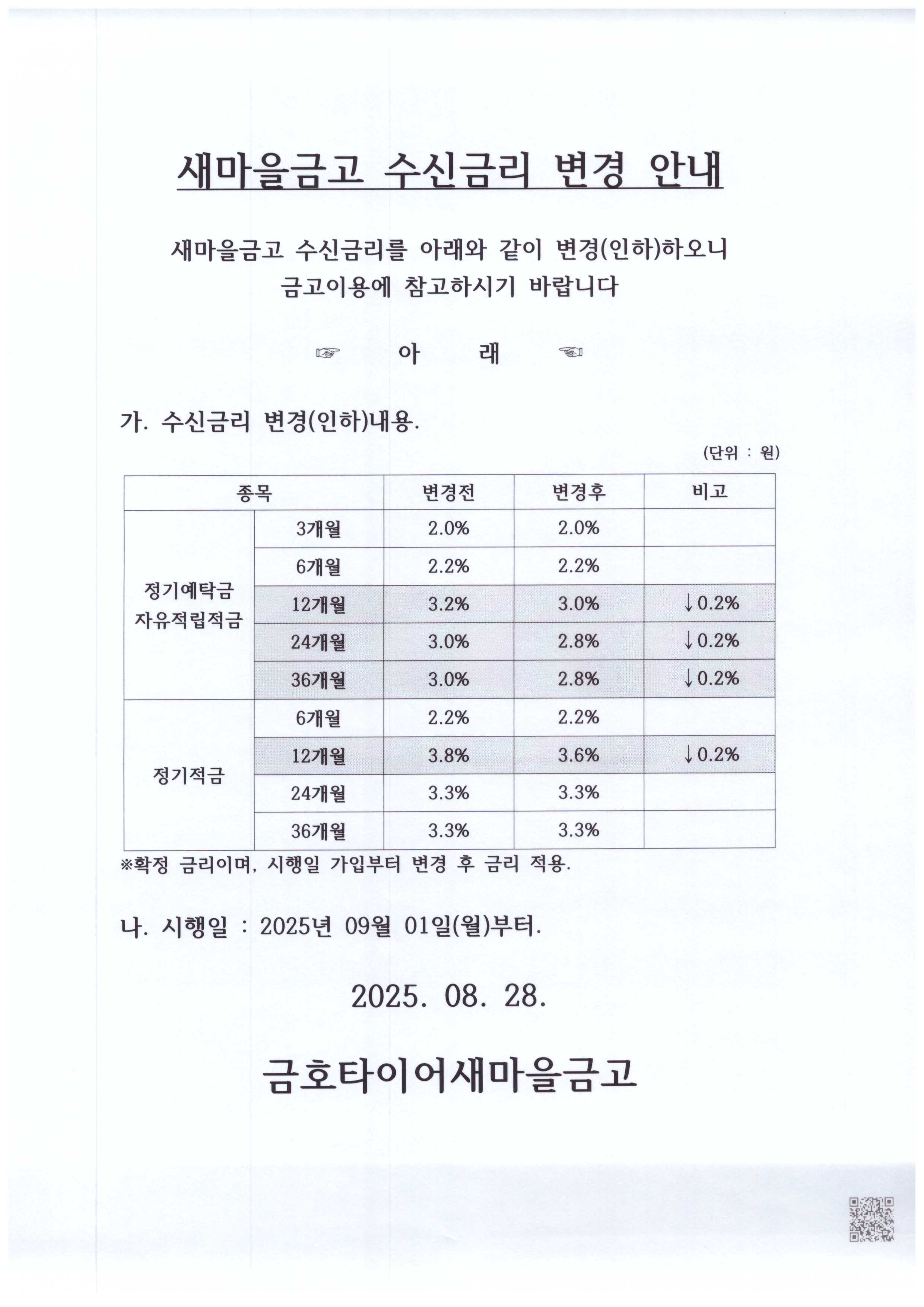 새마을금고 수신금리 변경(인하) 안내